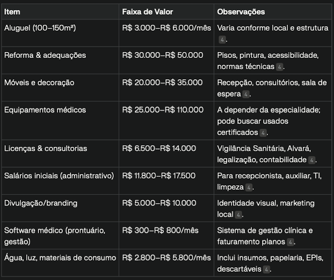 Investimento Inicial: de R$ 83.100 a R$ 213.300 para clínica básica; clínicas completas podem exigir R$ 200.000–R$ 300.000[4][6].